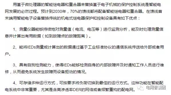 用基于微處理器的智能繼電器和重合器來替換基于電子機械的保護控制系統(tǒng)是智能電網發(fā)展的必然過程。預計到2030年,70%的饋線都將配備智能繼電器和重合器。在饋線首末端用智能電子設備替換傳統(tǒng)的機電式繼電器保護和控制設備具有如下優(yōu)點: