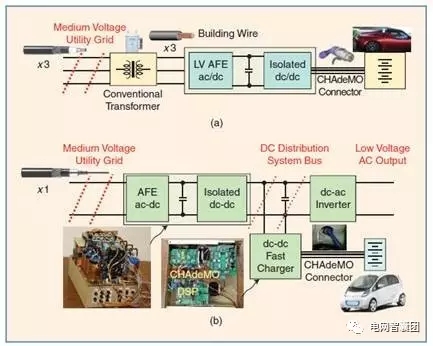 此外,EPRI還研發(fā)出了中壓智能通用變壓器(Intelligent Universal Transformer,IUT)。該技術替代了獨立的電能轉換器和傳統(tǒng)的變壓器,完全摒棄了傳統(tǒng)變壓器的笨重結構和大量的接線。多功能的IUT可提供400V的直流母線電壓,用于供應直流配電系統(tǒng)或為電動車快速充電,如下圖所示。
