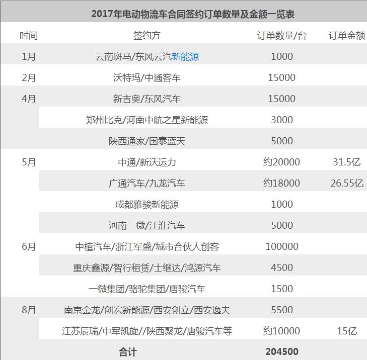 第一電動(dòng)網(wǎng)曾發(fā)文報(bào)道今年電動(dòng)物流車大訂單頻現(xiàn)的情況,根據(jù)該報(bào)道和7月29日杭州新能源汽車運(yùn)營產(chǎn)業(yè)聯(lián)盟上的簽約報(bào)道,可以粗略整理統(tǒng)計(jì)下今年的電動(dòng)物流車訂單數(shù)量,如下表: