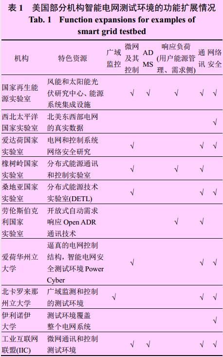 表1 列出了美國 DOE 國家實驗室和大學(xué)的部分智能電網(wǎng)測試環(huán)境的功能擴展情況。從表 1 中可以看出,雖然各實驗室和大學(xué)建設(shè)的測試平臺各具特色,但網(wǎng)絡(luò)安全和通信都成為其基本組成,一方面是因為通信和網(wǎng)絡(luò)安全貫穿整個智能電網(wǎng)架構(gòu);另一方面也反映了通信和網(wǎng)絡(luò)安全的重要性。