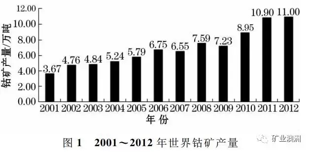 近年來,世界鈷礦產量呈明顯的上升趨勢,從2001年的3.67萬噸增長到2012年的11萬噸。盡管2008年受到全球金融危機的影響,2009年產量有所下降,但隨后的經濟逐漸恢復,使得產量進一步提高。特別是在2010年和2011年分別增長了23.8%和21.8%,由此可見,鈷產業(yè)正在快速發(fā)展(見圖1)。