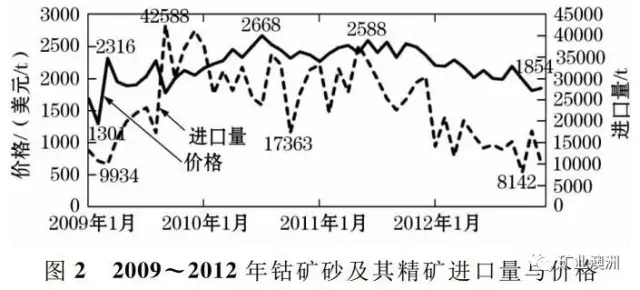 近4年來,鈷礦砂及其精礦進口量整體震蕩下滑,在2009年9月達到高峰值42,588噸,隨后的進口量震蕩降低。其價格整體來看呈較平穩(wěn)的走勢,2012年前價格基本在2000~2500美元/噸,2012年后價格持續(xù)下降,到年底平均價格已降到1,854美元/噸(見圖2)。