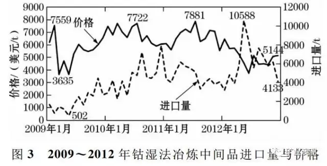 隨著經濟的快速發(fā)展,中國對鈷資源的需求量在逐漸增加,進口量保持相對穩(wěn)定。這不僅是因為中國國內鈷產品的大量生產,緩解了中國進口鈷產品的壓力;還因為中國堅持國外進口與國內生產并行的道路,極好地降低了他國對鈷價格壟斷的風險。同時,部分鈷產品的進口量與價格的反比例關系顯現了中國良好的進口策略。即每當價格升高時進口額降低,當價格降低時進口額猛增,在圖中顯示出上下呼應的三角形的形狀。這樣的進口策略極好地平抑了價格,降低了對中國進口的不利影響。