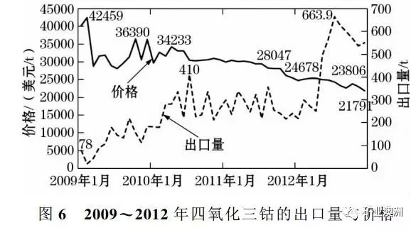 鈷酸鋰及其它金屬酸鹽及過金屬酸鹽的產品價格2009年最高。隨后的價格基本在10,000美元/噸上下浮動。隨著價格的降低并逐漸趨于相對穩(wěn)定,其出口量卻大幅增加,2011年年底最高出口量達到6,113噸(見圖5)。四氧化三鈷的價格整體呈現持續(xù)下滑的趨勢。與此相反的是其出口量卻在逐年增加(見圖6)。