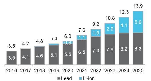 北美和歐洲地區(qū)2016-2025年度數(shù)據(jù)中心鋰離子電池總體需求(GWh)