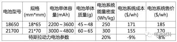 今年初特斯拉披露的信息來(lái)看,在現(xiàn)有條件下,其生產(chǎn)的21700電池系統(tǒng)的能量密度在300Wh/kg左右,比其原來(lái)18650電池系統(tǒng)的250Wh/kg約提高20%。