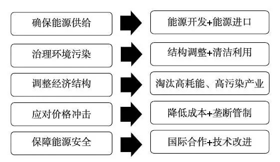 能源革命的目標(biāo)應(yīng)該由確保能源供給、治理環(huán)境污染、調(diào)整經(jīng)濟(jì)結(jié)構(gòu)、應(yīng)對價格沖擊、保障能源安全五個維度構(gòu)成。