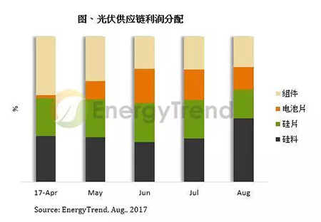 此外,由于8月正值歐美需求高峰,臺(tái)系與第三地電池片廠皆訂單滿手,此時(shí)原料的供應(yīng)緊張迫使電池片廠不得不接受上游硅片的成本轉(zhuǎn)嫁,以滿足生產(chǎn)訂單;而訂單壓力較輕的陸系中小型廠則選擇降低稼動(dòng)率來因應(yīng),產(chǎn)業(yè)鏈利潤(rùn)因此顯著向上游轉(zhuǎn)移。