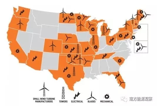 美國(guó)有27個(gè)州是生產(chǎn)各種小型風(fēng)力渦輪機(jī)組件的所在地
