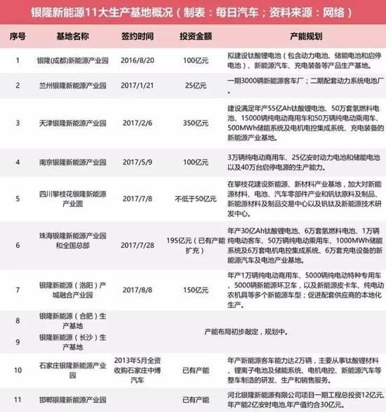 1月21日,蘭州銀隆新能源產(chǎn)業(yè)園項目簽約,前兩期共計劃投資25億元建設新能源客車生產(chǎn)基地,已于5月開工。5月4日,珠海銀隆全資子公司廣通汽車向江蘇九龍汽車制造有限公司采購26.55億元的電動物流車。同月,總投資100億元的銀隆新能源南京基地在溧水區(qū)開工,建設周期為2017年至2018年。