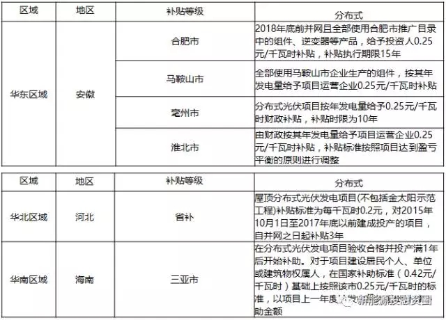 通過(guò)查詢?nèi)珖?guó)所有省市縣光伏補(bǔ)貼政策,并加上補(bǔ)貼測(cè)算收益率,可以看出部分省市縣加上補(bǔ)貼可以滿足全額上網(wǎng)類項(xiàng)目投資收益率。加上補(bǔ)貼政策滿足收益率的補(bǔ)貼政策見(jiàn)下表。