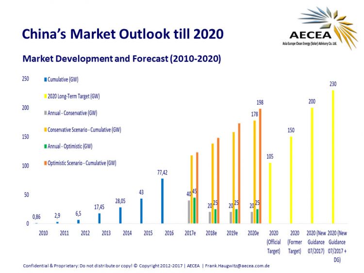 隨著7月份部署10.52吉瓦太陽能,AECEA提高了其2017年的預(yù)測,預(yù)計到年底,中國可能有望新增40-45吉瓦的太陽能容量。這相當(dāng)于16%同比增長率,并且有望超過2016年創(chuàng)紀錄部署容量30%。