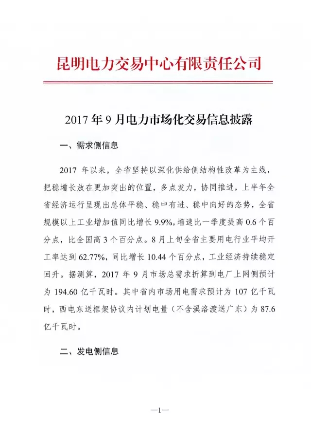 8月18日,昆明電力交易中心發(fā)布了2017年9月電力市場(chǎng)化信息披露,據(jù)測(cè)算,2017年9月市場(chǎng)總需求折算到電廠(chǎng)上網(wǎng)側(cè)預(yù)計(jì)為194.60億千瓦時(shí)。其中省內(nèi)市場(chǎng)用電需求預(yù)計(jì)為107億千瓦時(shí),西電東送框架協(xié)議內(nèi)計(jì)劃電量(不含溪洛渡送廣東)為87.6億千瓦時(shí)。