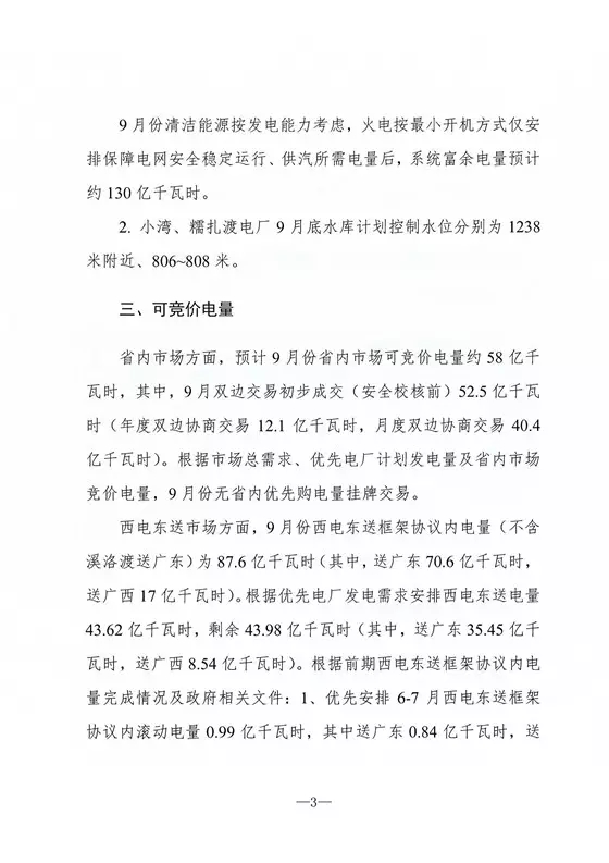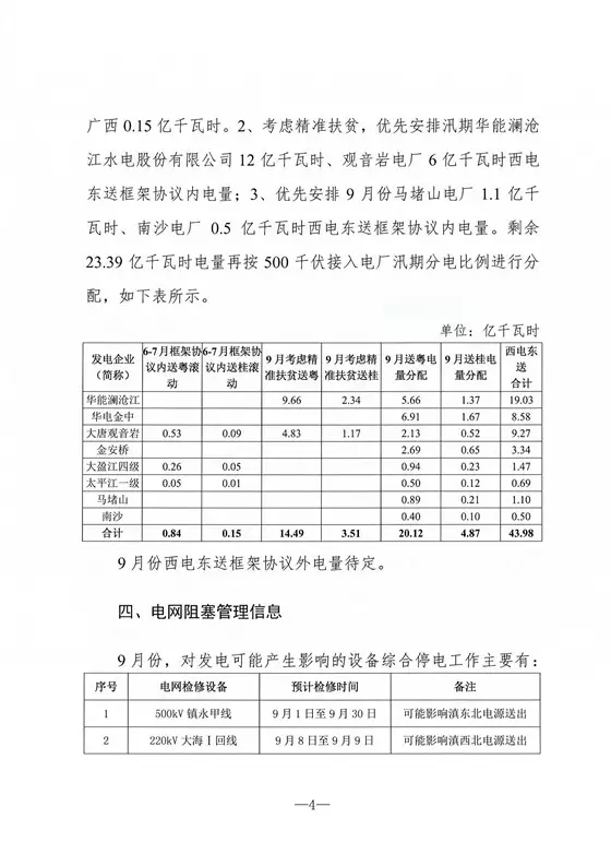 西電東送市場(chǎng)方面,9月份西電東送框架協(xié)議內(nèi)電量為87.6億千瓦時(shí)(其中,送廣東70.6億千瓦時(shí),送廣西17億千瓦時(shí))