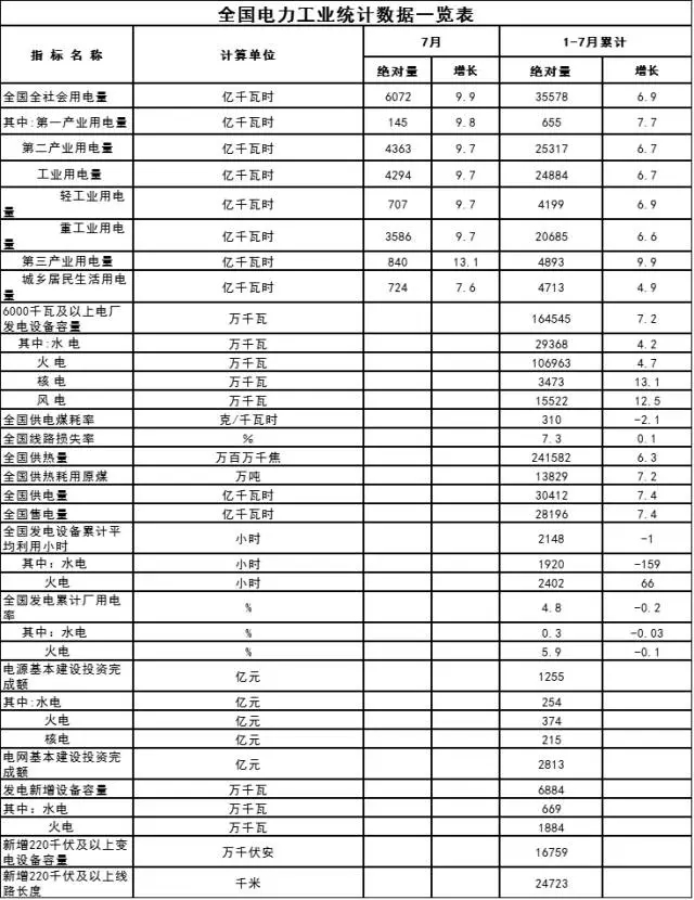 1-7月份全國(guó)電力工業(yè)統(tǒng)計(jì)數(shù)據(jù):全國(guó)售電量28196億千瓦時(shí) 增7.4%
