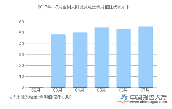 2017年1-7月全國(guó)太陽(yáng)能發(fā)電量當(dāng)月值柱狀圖如下: