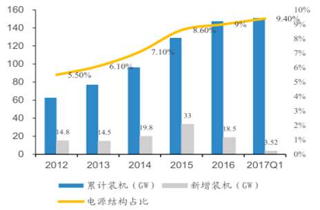 2016年全球累計(jì)吊裝容量達(dá)到486.8GW,其中新增裝機(jī)風(fēng)電容量為54.6GW,國內(nèi)市場(chǎng)占比 43%。全球風(fēng)能理事會(huì)預(yù)計(jì) 2017 年全球風(fēng)電新增裝機(jī)容量將超過60GW,并在未來五年內(nèi)維持穩(wěn)定增長,到 2021 年累計(jì)裝機(jī)將超過 800GW。截止 2017 年 1 季度末,國內(nèi)累計(jì)風(fēng)電并網(wǎng)容量 151GW,環(huán)比增加 3.52GW。風(fēng)電裝機(jī)占電源總裝機(jī)的比重持續(xù)提高至 9.4%。