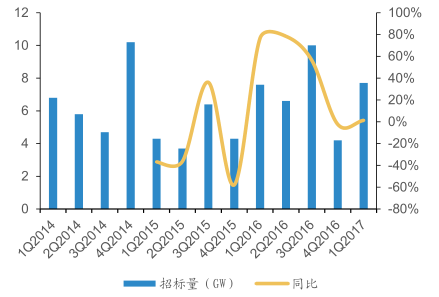 今年以來,國內(nèi)公開招標(biāo)容量為 7.7GW,維持去年同期較高水平。2016 年全年公開招標(biāo)容量達(dá)到 28.3GW,同比增長 51.3%。從風(fēng)電消納來看,今年風(fēng)電消納持續(xù)好轉(zhuǎn),一季度上網(wǎng)電量 687 億 kWh,占全社會(huì)用電量的 4.8%,較同期增長0.6%。預(yù)計(jì)風(fēng)電消納占比到 2020 年有望達(dá)到 6%以上。