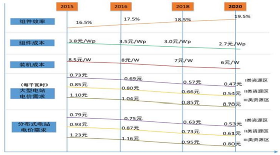 從行業(yè)發(fā)展周期來看,光伏比風(fēng)電發(fā)展滯后三年左右;而今年來光伏電池技術(shù)進(jìn)步加快,因此最遲 2019 年,光伏項(xiàng)目的補(bǔ)貼強(qiáng)度與目前風(fēng)電的補(bǔ)貼強(qiáng)度基本相同。到 2020 年,地面光伏電站項(xiàng)目可以實(shí)現(xiàn)平價(jià)上網(wǎng)。實(shí)現(xiàn)平價(jià)上網(wǎng)的途徑是降低度電成本。