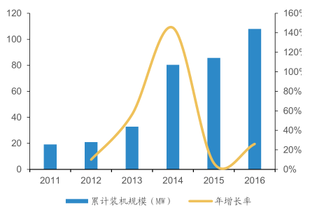 2011-2016年國內(nèi)投運(yùn)儲(chǔ)能裝機(jī)量(不含抽水儲(chǔ)能和儲(chǔ)熱項(xiàng)目)