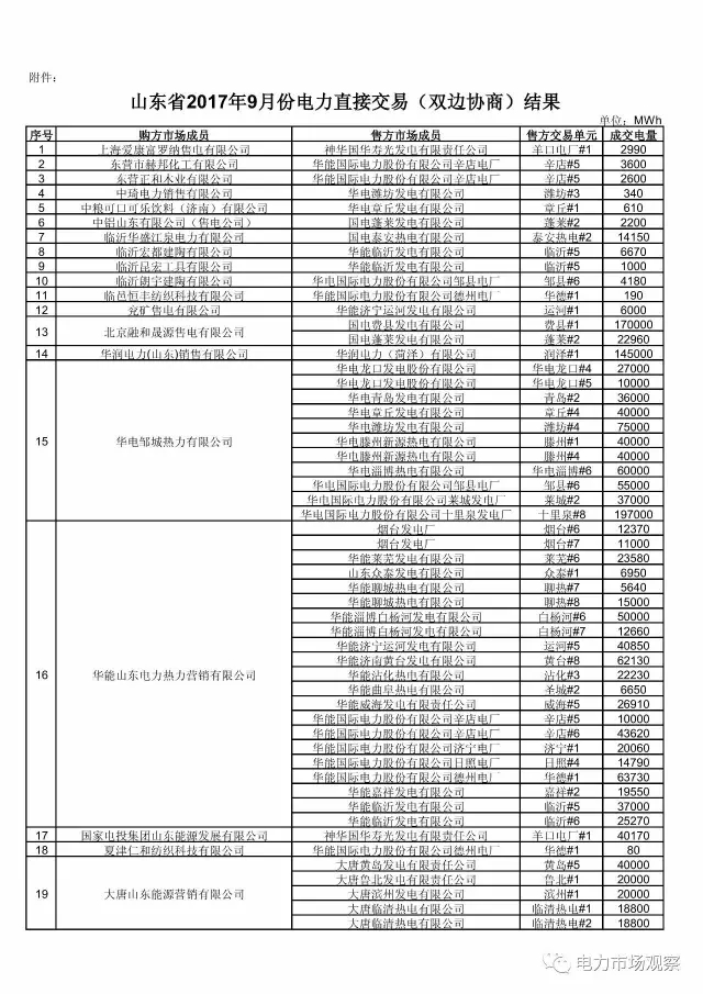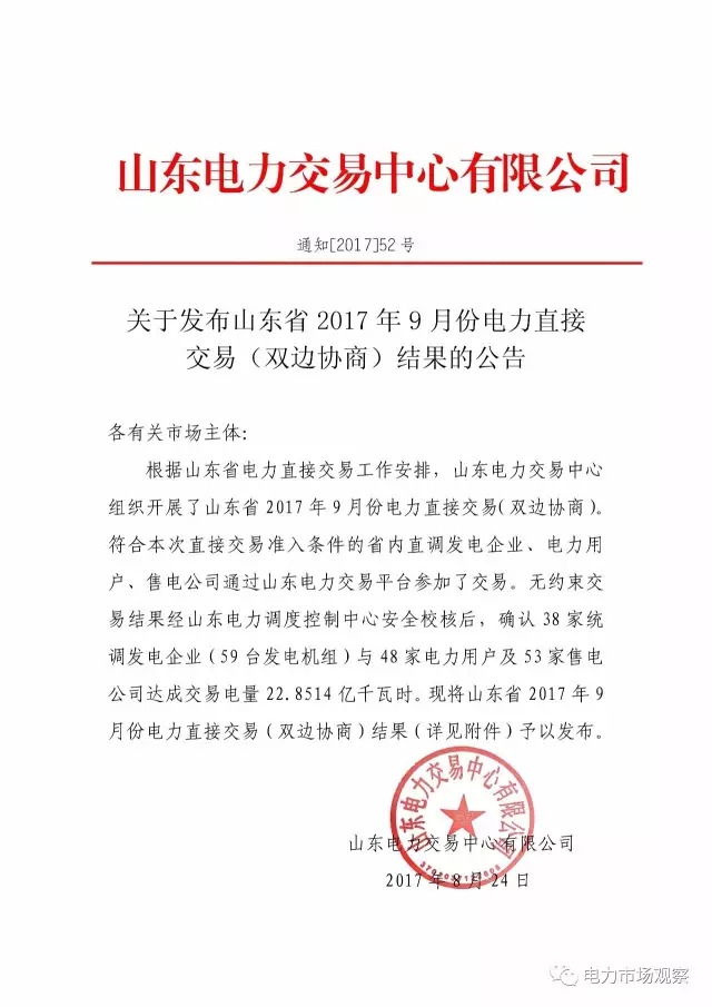 中國儲能網(wǎng)訊:今天(8月24日),山東電力交易中心發(fā)布《關(guān)于發(fā)布山東省2017年9月份電力直接交易(雙邊協(xié)商)結(jié)果的公告》。