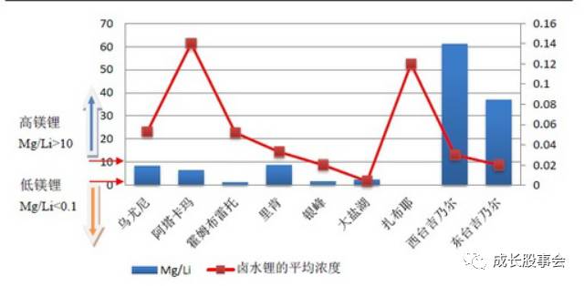 圖3:全球主要鹽湖鎂鋰比(左軸)及鹵水鋰平均濃度(右軸,單位:%)