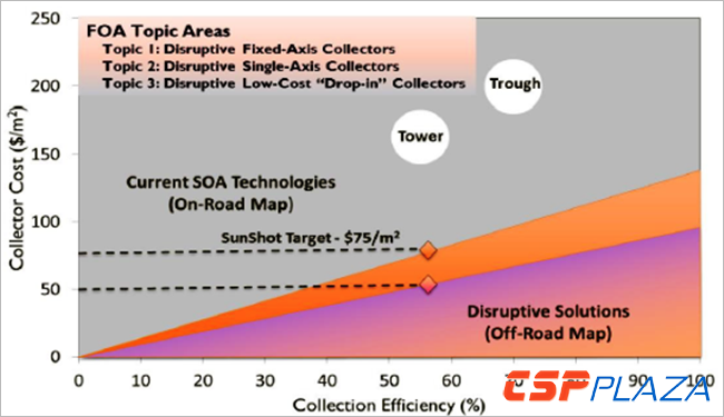 圖:SunShot計(jì)劃將槽式集熱器成本從約200美元/平方米降低到75美元/平方米。(數(shù)據(jù)來(lái)源:美國(guó)能源部)