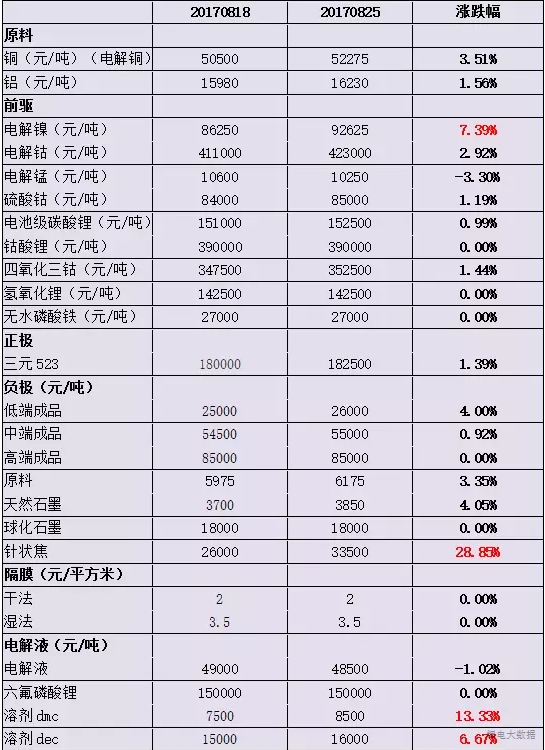 上周?chē)?guó)內(nèi)三元材料市場(chǎng)價(jià)格暫時(shí)平穩(wěn),現(xiàn)市場(chǎng)上NCM523主流價(jià)在18-18.5萬(wàn)元/噸。由于第三季度歷年被業(yè)內(nèi)普遍的認(rèn)為是行業(yè)旺季,主要體現(xiàn)在新能源汽車(chē)年度補(bǔ)貼政策明確;更多的主流廠商的鋰電池能量密度符合國(guó)家補(bǔ)貼標(biāo)準(zhǔn);各地新能源汽車(chē)銷(xiāo)售指標(biāo)要求等方面,所以在三元材料擴(kuò)產(chǎn)或新上的情況明顯增多,不少第一梯隊(duì)的客戶(hù)開(kāi)始更多關(guān)注高鎳市場(chǎng)。電解鎳方面的較大漲幅;主要原因是金屬鎳價(jià)上調(diào),隨著鎳鹽需求量的增加以及金屬鎳的缺口漸顯,后期電解鎳價(jià)格上漲可期。