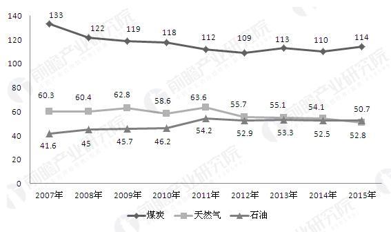 2007-2015年全球傳統(tǒng)能源的儲(chǔ)采比情況(單位:年)