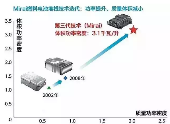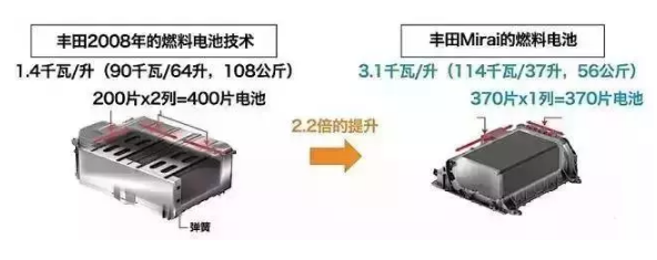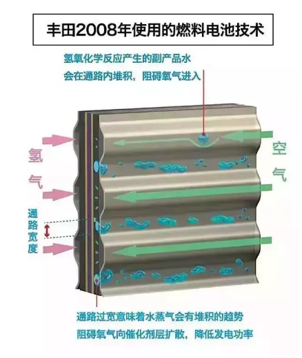 豐田Mirai搭載的燃料電池堆棧是由370片薄片燃料電池組成的,因此被稱為“堆棧”,一共可以輸出114千瓦的發(fā)電功率。此前我們也分析了大眾集團的燃料電池技術,結(jié)構(gòu)基本類似。豐田的燃料電池堆棧經(jīng)歷了十幾年的技術優(yōu)化,形成了自己的特色結(jié)構(gòu),比如3D立體微流道技術,通過更好地排出副產(chǎn)物水,讓更多空氣流入,有效改善了發(fā)電效率。所以整個堆棧的發(fā)電效率達到了世界先進水平,達到了3.1千瓦/升,比2008年豐田的技術整整提升了2.2倍。