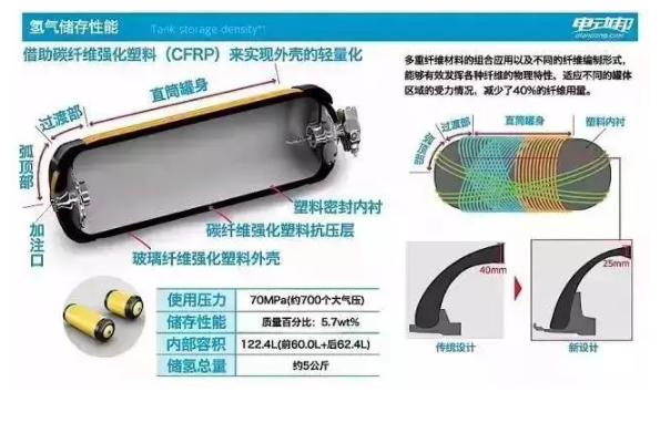 儲氫罐被設計成四層結(jié)構(gòu),鋁合金的罐體內(nèi)部襯有塑料內(nèi)膽,外面包裹一層碳纖維強化塑料的保護層,保護層外側(cè)再增加一層玻璃纖維材料的減震保護層,并且每一層的纖維紋路都根據(jù)所處罐身位置不同而做了額外的優(yōu)化,使纖維順著壓力分布的方向,提升保護層的效果。