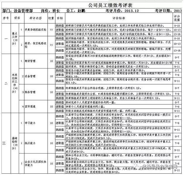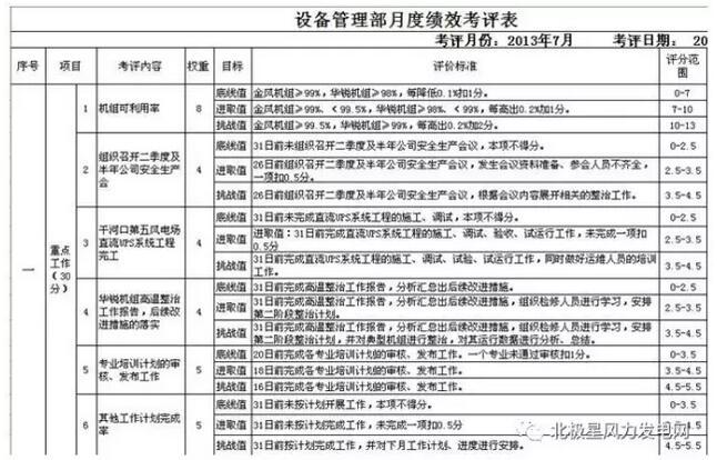 工作業(yè)績(jī)按照部門、班組、個(gè)人進(jìn)行三級(jí)考評(píng),月初由部門、班組、個(gè)人各自完成三級(jí)績(jī)效考評(píng)項(xiàng)目的申報(bào),申報(bào)的依據(jù):部門績(jī)效考評(píng)項(xiàng)目按照公司月度工作計(jì)劃進(jìn)行編制;班組績(jī)效考評(píng)項(xiàng)目按照部門月度工作計(jì)劃進(jìn)行編制;個(gè)人績(jī)效考評(píng)項(xiàng)目按照班組月度工作計(jì)劃進(jìn)行編制,按照自上而下管理的原則進(jìn)行管理。工作業(yè)績(jī)的考評(píng)按照百分制進(jìn)行,其中月度重點(diǎn)工作所占比重為30%,KPI關(guān)鍵績(jī)效指標(biāo)所占比重為50%,基礎(chǔ)指標(biāo)所占比重為20%。下面就以風(fēng)電場(chǎng)設(shè)備管理部、檢修班組以及檢修員月度績(jī)效考評(píng)內(nèi)容為例。
