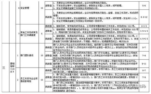 為了使員工的工作業(yè)績(jī)達(dá)到“跳起來摘桃子”的效果,通過對(duì)工作內(nèi)容的充分定位、定量,創(chuàng)新開展了以底線值為基礎(chǔ),進(jìn)取值為升華,挑戰(zhàn)值為突破的管理模式。進(jìn)取值、挑戰(zhàn)值的方向則按照工作內(nèi)容的不同量身制定,既要體現(xiàn)出該指標(biāo)三個(gè)值的的差距,同時(shí)也要考慮該值的可完成性,避免出現(xiàn)望塵莫及,打擊員工工作的積極性。具體內(nèi)容,見各考評(píng)表。