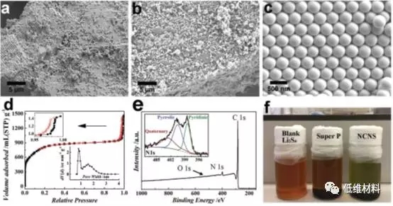 圖1.關(guān)于NCNS的結(jié)構(gòu)的表征。(1a)制備NCNS的前驅(qū)體為單分散的酚醛樹脂納米球(PRNS),將其通過離心可以制備具有緊密堆疊結(jié)構(gòu)的PRNS團簇。(1b與1c)為將PRNS通過碳化,CO2活化,NH3氮化之后得到的NCNS結(jié)構(gòu)。(1d)為NCNS的氮氣吸脫附曲線及孔徑分布圖,且孔徑分布顯示為多為微孔結(jié)構(gòu)。(1e)XPS來表征NCNS的化學(xué)特性,結(jié)果表明該材料含有C (94 wt%), O(1 wt%)和 N (5 wt%). 且N 1s 可以分為吡啶氮,吡咯氮以及四價氮。吡啶氮和吡咯氮對于限制多硫化物的溶解具有十分明顯的作用。(1f)superP 與NCNS對多硫化物的吸附測試顯示NCNS對多硫化物有明顯的吸附作用。