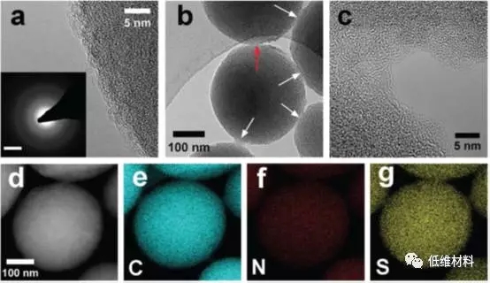 圖2, NCNS-S70的微觀結(jié)構(gòu)。(2a)NCNS-S70的邊緣HRTEM結(jié)構(gòu)圖以及電子衍射圖。(2b)相互交聯(lián)的納米球結(jié)構(gòu)的HRTEM結(jié)構(gòu)圖.(2c)接觸位置的特寫HRTEM圖。(2d-2g)納米球結(jié)構(gòu)的HAADF圖以及C、N、O元素的分布圖。