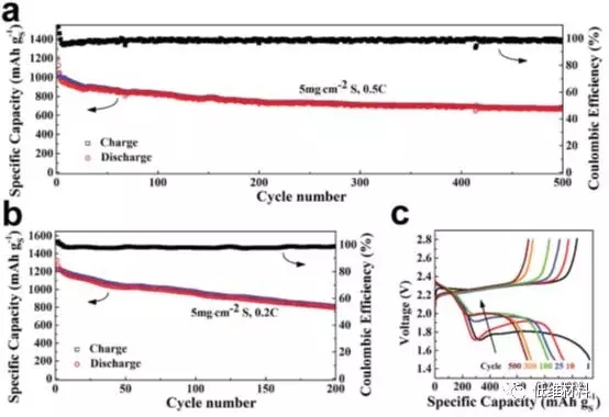 圖4,負(fù)載量為5 mg cm-2的電極材料的長循環(huán)測試。(a)為電池在0.5C的情況下循環(huán)500圈的容量及庫倫效率。(b)為電池在0.2C的情況下循環(huán)200圈的容量及庫倫效率.(c)為電池在500圈循環(huán)過程中的充放電曲線的變化。測試結(jié)果顯示該電極材料具有十分有益的電化學(xué)性能。