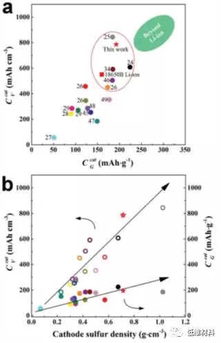 圖5,(a)負(fù)載量為5 mg cm-2的NCNS-S70電極材料組裝的電池與商用化鋰離子電池之間的體積比容量對比。(b)不同材料的質(zhì)量比容量與體積比容量和電極硫密度之間的關(guān)系。結(jié)果表明對比于其他材料來說,該材料對于制備高體積能量密度的鋰硫電池來說具有巨大的優(yōu)勢。