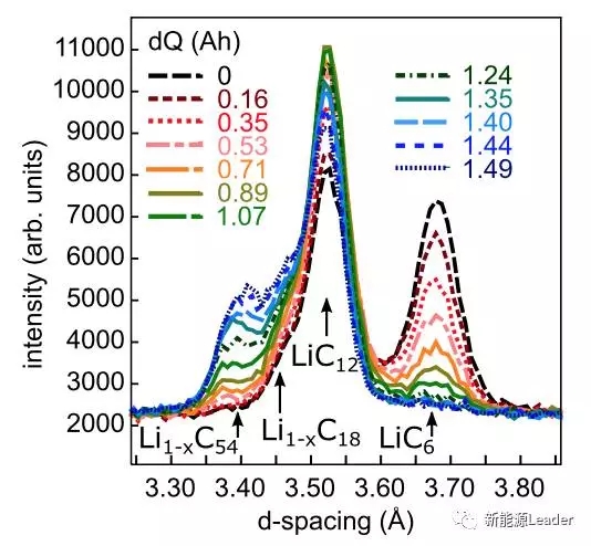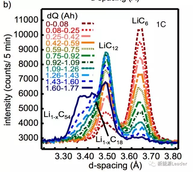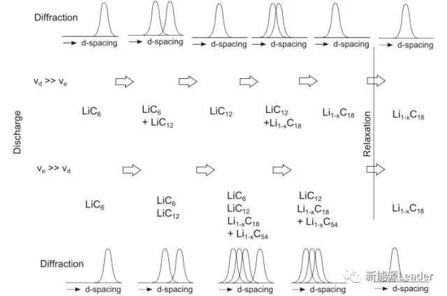 下圖為石墨負極在不同的放電倍率下的物相變化圖,從圖上可以看到,當Li+脫出的速度Ve小于Li+在石墨的內的擴散速度Vd時(小倍率放電),此時石墨負極應該始終保持平衡,因此在衍射圖上應該會觀測到單相、兩相共存的衍射峰,如果Ve大于Vd的情況下,在石墨顆粒的內部會形成Li的濃度梯度,顆粒內部會形成富鋰內核,外部會形成貧鋰的外殼,所有的這些物相會同時觀測到,并且只有在充分擱置后才能消失??梢娫谏鲜龅膶嶒炛?,在C/2和1C倍率下,石墨負極都是多種物相共存,證明Li+的脫出速率都要高于Li+在石墨中的擴散速率,因此放電后需要一段時間的擱置以達到顆粒內部的均衡。