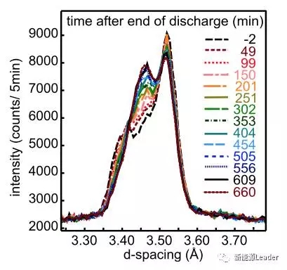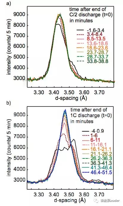 一般而言,這種電極內的不均勻性,可以通過適當的擱置,讓Li在石墨內進行擴散,減少不均勻性。下圖為放電結束后,電池擱置過程中負極的物相變化,可以看到在擱置過程中物相變化還是很大的,特別是1C倍率放電后擱置的電池。變化最大的過程主要發(fā)生在前10min,主要的變化過程分別在20min(C/2倍率)和40min(1C倍率)結束。在1C放電倍率下的電池負極的衍射峰在d=3.4731,對應的負極化合物為LiC18-LiC36或者LiC26-LiC36,或者兩種物相的混合,而C/2倍率下放電的電池的衍射峰仔d=3.4340左右,對應的負極化合物LiC36-LiC72和LiC54-LiC85。
