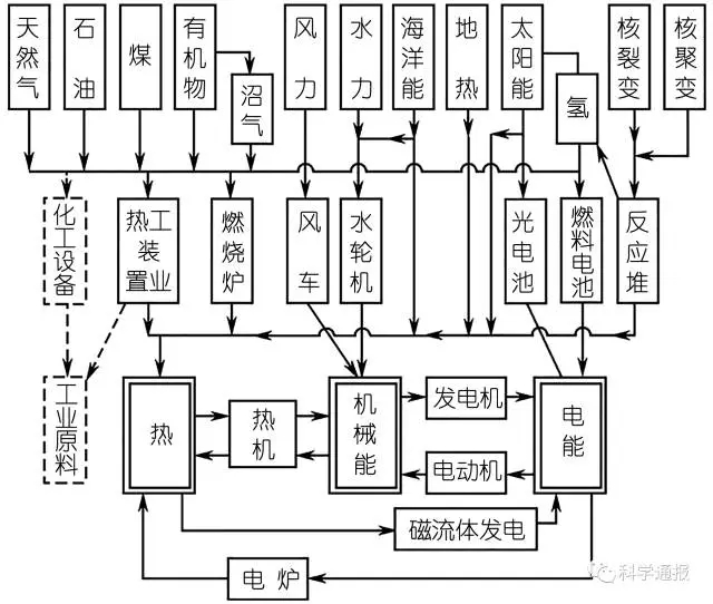 20世紀80年代初, 在對能源利用的核心科學(xué)問題進行全面深入地綜合與總結(jié)后, 吳仲華提出了基于熱能品位概念的“溫度對口、梯級利用”理念, 作為普遍適用的熱能利用原理, 對能源動力的發(fā)展應(yīng)用具有重要的意義。他通過圖1來表示各種能源經(jīng)過各種設(shè)備轉(zhuǎn)化為各種不同形式的能來使用的情況。他認為在開發(fā)利用能源時, 要認真比較各種能源的優(yōu)缺點, 對各種能源的品質(zhì)很好地加以綜合考慮; 現(xiàn)代科學(xué)技術(shù)的發(fā)展將為較大幅度地提高能源利用率提供可能性和多樣性, 但都必須重視基于能的品位概念的梯級利用理念。