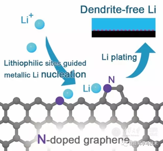通過摻氮石墨烯上具有親鋰性的含氮官能團(tuán)(吡啶氮、吡咯氮等)作為形核位點(diǎn),促進(jìn)電解質(zhì)中的鋰離子在充電開始時優(yōu)先吸附在導(dǎo)電親鋰的位點(diǎn)上進(jìn)而沉積形成均勻分布的金屬鋰形核點(diǎn),在后續(xù)充電過程中,鋰離子將基于這些均勻形核點(diǎn)進(jìn)行均勻沉積。