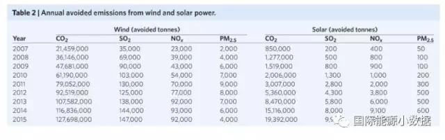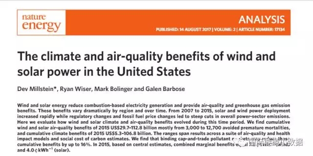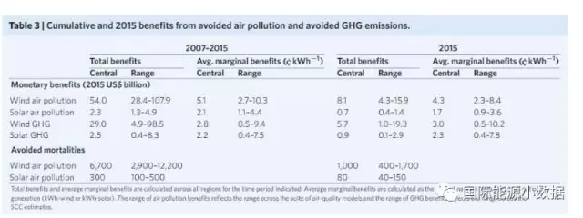 綜上表所述,2007年至2015年間,美國(guó)因光伏、風(fēng)電的發(fā)電量減少二氧化硫排放100萬噸、氮氧化物60萬噸、PM2.55萬噸。伯克利實(shí)驗(yàn)室估計(jì),相應(yīng)地空氣改善使得7000人避免了過早死亡,相當(dāng)于節(jié)省了560億美元的公共健康開支。此外,這期間因光伏、風(fēng)電避免的二氧化碳排放相當(dāng)于320億美元。2015年,美國(guó)風(fēng)電的空氣質(zhì)量和氣候平均收益相當(dāng)于7.3美分/千瓦時(shí),而光伏的收益為4.0美分/千瓦時(shí)。上述數(shù)字為全美的平均值,各地具體收益有所不同,特別是中大西洋地區(qū)的風(fēng)電收益高達(dá)14.3美分/千瓦時(shí),而加利福尼亞風(fēng)電收益僅有2.5美分/千瓦時(shí)。