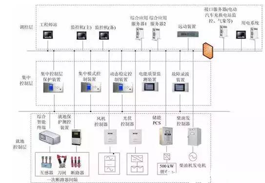 微電網(wǎng)的體系結構一般采用國際上比較成熟的三層結構(許繼的示范工程也是如此):配電網(wǎng)調(diào)度層、微電網(wǎng)集中控制層、分布式電源和負荷就地控制層。