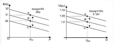 下垂控制:即選擇與傳統(tǒng)發(fā)電機相似的頻率一次下垂特性曲線(DroopCharacter)作為控制方式,即分別通過P/f下垂控制和Q/V下垂控制來獲取穩(wěn)定的頻率和電壓,這種控制方法對微網(wǎng)中的微源輸出的有功功率和無功功率分別進行控制,無需機組間的通信協(xié)調(diào),實現(xiàn)了微源即插即用和對等控制的目標。