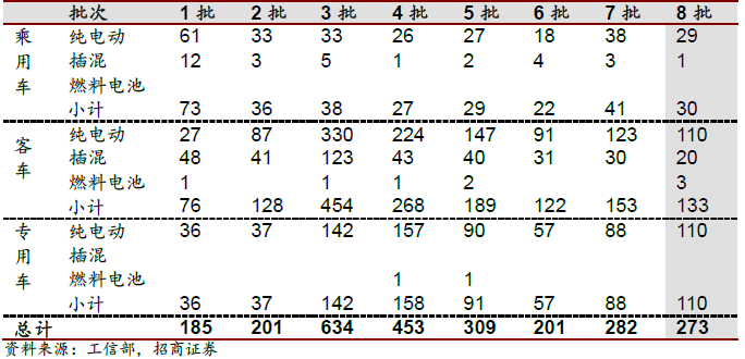 目錄車型數(shù)量略有下滑:工信部9月1日如期公布了第8批目錄,本批目錄共95家企業(yè)的273個(gè)車型入選,環(huán)比略有3%的下滑。目前已發(fā)布的前8 批目錄累計(jì)已超過(guò)去年全年水平。