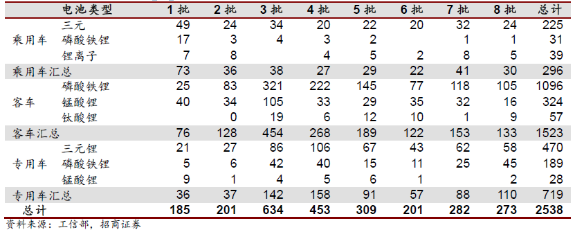 配套電池仍保持著高能量密度。從目前已經(jīng)披露的電池信息來(lái)看,本批乘用車/客車能量密度均值為125/117Wh/kg,整體與第6批水準(zhǔn)持平,較第7批略有下降,但仍顯著高于前5批的水準(zhǔn)。我們認(rèn)為這與磷酸鐵鋰占比上升相關(guān),電池高能量密度是大勢(shì)所趨,配套的正極、負(fù)極、電解液、隔膜、添加劑產(chǎn)業(yè)也面臨著機(jī)遇和挑戰(zhàn)。