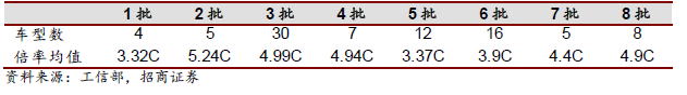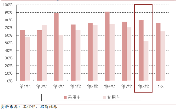 據(jù)調(diào)研,在第8批目錄中,符合1.2倍補(bǔ)貼要求的純電動(dòng)乘用車比例為67%,較第6, 批有所下降,但是高于前5批的水準(zhǔn)??蛙囍懈吣芰棵芏鹊恼急认陆禐?7%,整體呈現(xiàn)向中密度集中的趨勢(shì)。