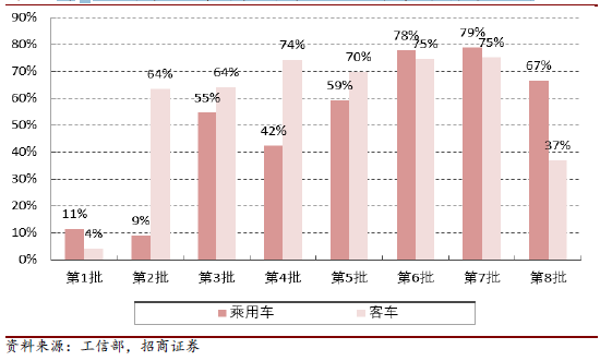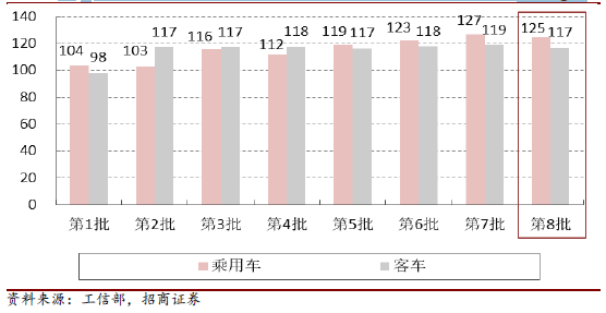 與之相反,客車持續(xù)著較低迷的表現(xiàn),共133 款,環(huán)比下降13%,占比49%。乘用車原本占比較小,本批次雖然下降27%,但仍有30 款車型,較為符合預(yù)期。因此就車型來(lái)看,后續(xù)專用車的持續(xù)放量值得關(guān)注。