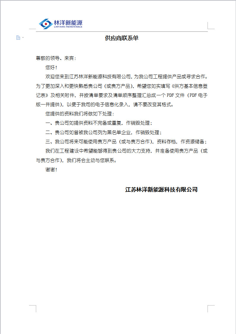 1.1、根據(jù)江蘇林洋新能源科技有限公司2017-2018年度1GW光伏電站的投資計(jì)劃需求,現(xiàn)就所需的逆變器、箱變、匯流箱、開關(guān)柜、二次設(shè)備、SVG、GIS、預(yù)制倉、支架、電纜單位在全國范圍內(nèi)進(jìn)行合格供應(yīng)商入圍評(píng)選活動(dòng)。入圍有效期至2018年12月31日止。歡迎有意愿、有合格資質(zhì)條件的供應(yīng)商積極參加本次合格供應(yīng)商資格預(yù)審。