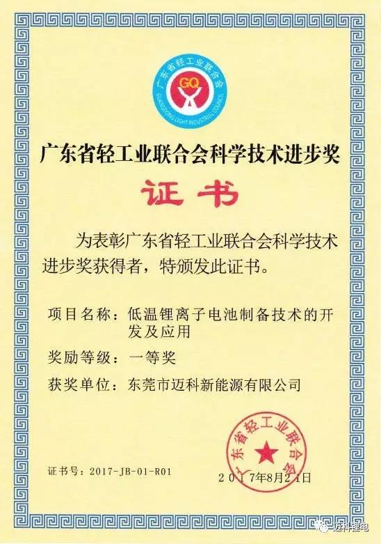 中國儲能網(wǎng)訊:近日,廣東輕工網(wǎng)傳來喜訊:經廣東省輕工業(yè)聯(lián)合會科學技術獎勵專業(yè)組評審、廣東省輕工業(yè)聯(lián)合會科學技術獎勵委員會審定和廣東省輕工業(yè)聯(lián)合會的批準,2017年度廣東省輕工業(yè)聯(lián)合會對為我省輕工業(yè)科技進步、經濟社會發(fā)展、輕工行業(yè)現(xiàn)代化建設做出貢獻的科學技術人員和組織給予表彰。本次授獎項目共41項,其中一等獎10項。東莞市邁科新能源有限公司承擔的“低溫鋰離子電池制備技術及應用”項目喜獲廣東省科學技術進步獎一等獎!